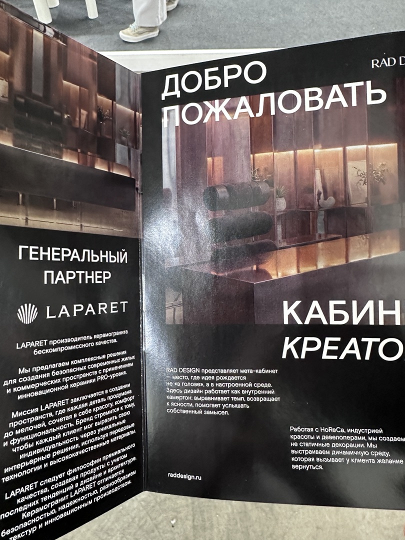 Сотрудничество с RAD DESIGN позволило нашему бренду подчеркнуть свою приверженность поддержке локальных дизайнерских инициатив. RAD DESIGN, известный фокусом на актуальные российские проекты в HoReCa и исследования формы, представил работы, которые органично дополнили экспозицию стенда. Посетители стенда могли увидеть, как интерьерные решения бренда взаимодействуют с экспериментальными формами молодых дизайнеров, создавая целостную картину современного пространства.